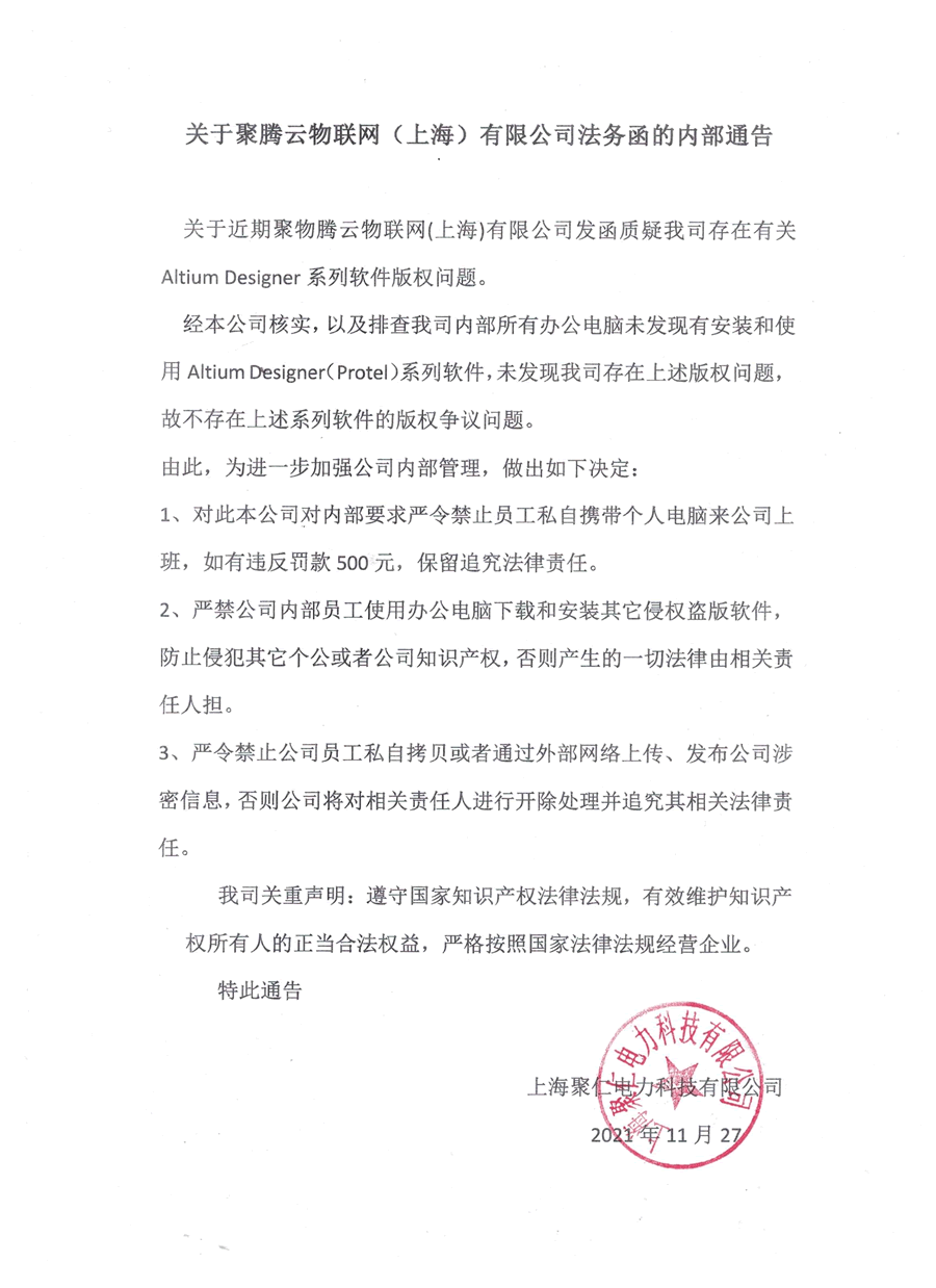 關(guān)于聚騰云物聯(lián)(上海)有限公司法務(wù)函的內(nèi)部通告