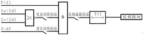 該保護(hù)可實(shí)現(xiàn)分散式的頻率控制,當(dāng)系統(tǒng)頻率低于設(shè)定值時(shí),保護(hù)動作切除負(fù)荷。保護(hù)可通過控制字選擇經(jīng)低流閉鎖和滑差閉鎖。