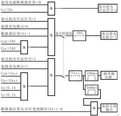 對于雙電源供電系統(tǒng),利用該保護(hù)可以實(shí)現(xiàn)兩路電源自動互投,典型應(yīng)用于進(jìn)線備自投或母分備自投。備自投動作過程為,當(dāng)檢測到本側(cè)電源失壓,備自投保護(hù)啟動跳開本側(cè)開關(guān),確認(rèn)本側(cè)電源開關(guān)跳開后,合備用電源開關(guān)。備自投保護(hù)必須在充電完成后才能動作。